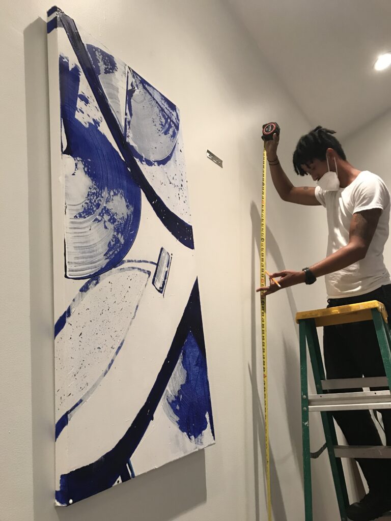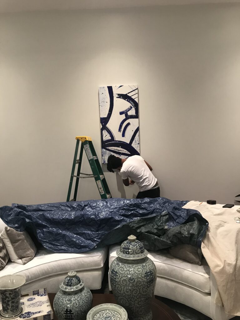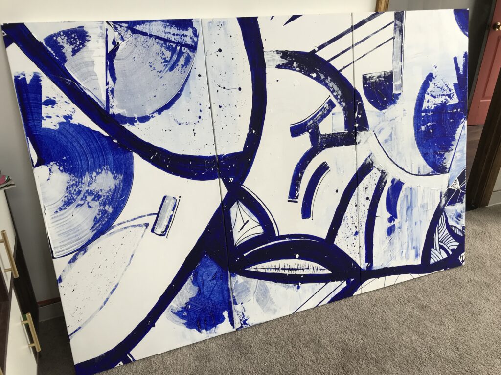 “One World” is a piece that was commissioned in the summer of 2021 by a woman who had a very specific interest in mind. She had three 30″ x 60″ canvases purchased by her late husband, whom she wanted to honor. He was an artist, designer, architect, and more, who had an extensive collection of blue and white items.
